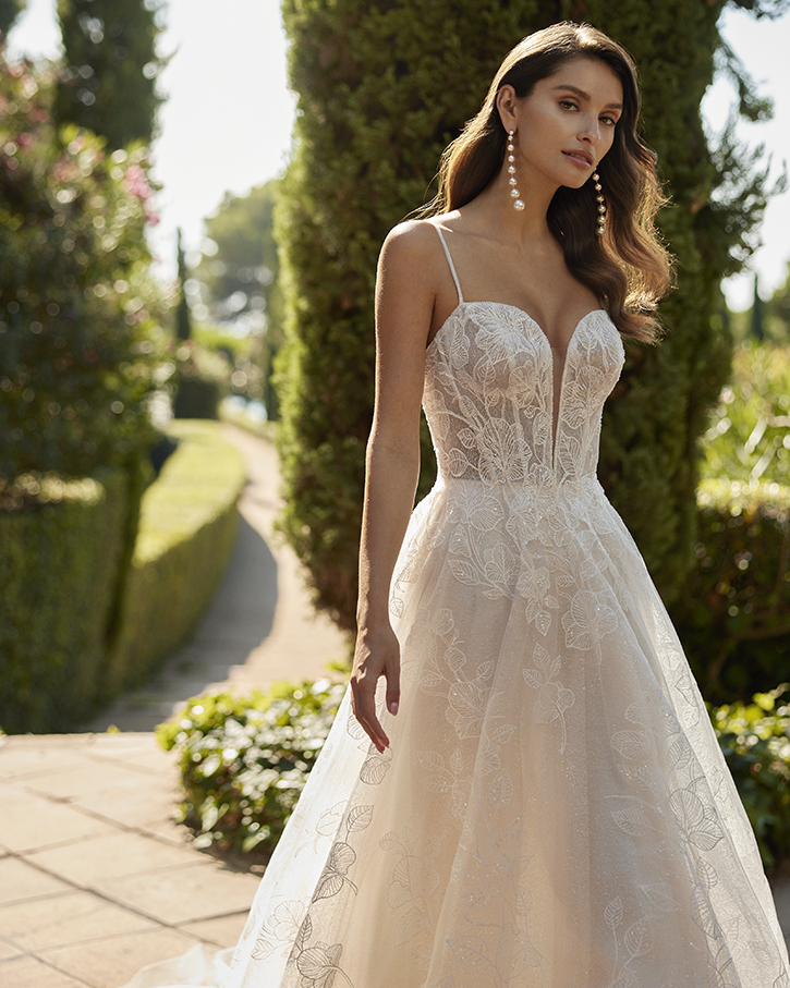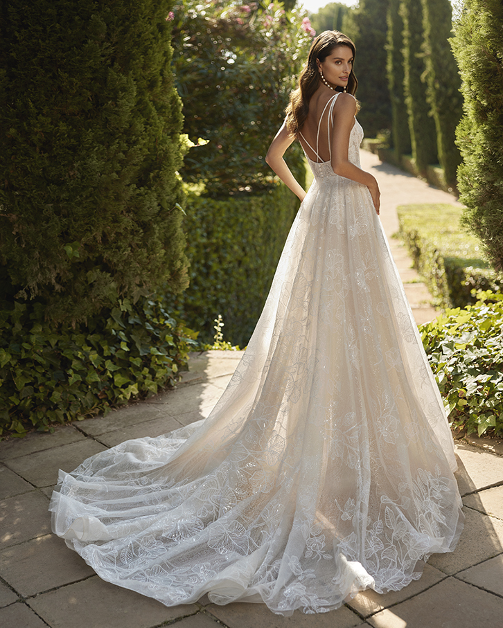 Vestido de novia con silueta en línea A y estilo sexy, confeccionado en encaje, pedrería y tul glitter. Presenta un escote profundo y una espalda con tirantes cruzados. Un exclusivo modelo Adriana Alier.