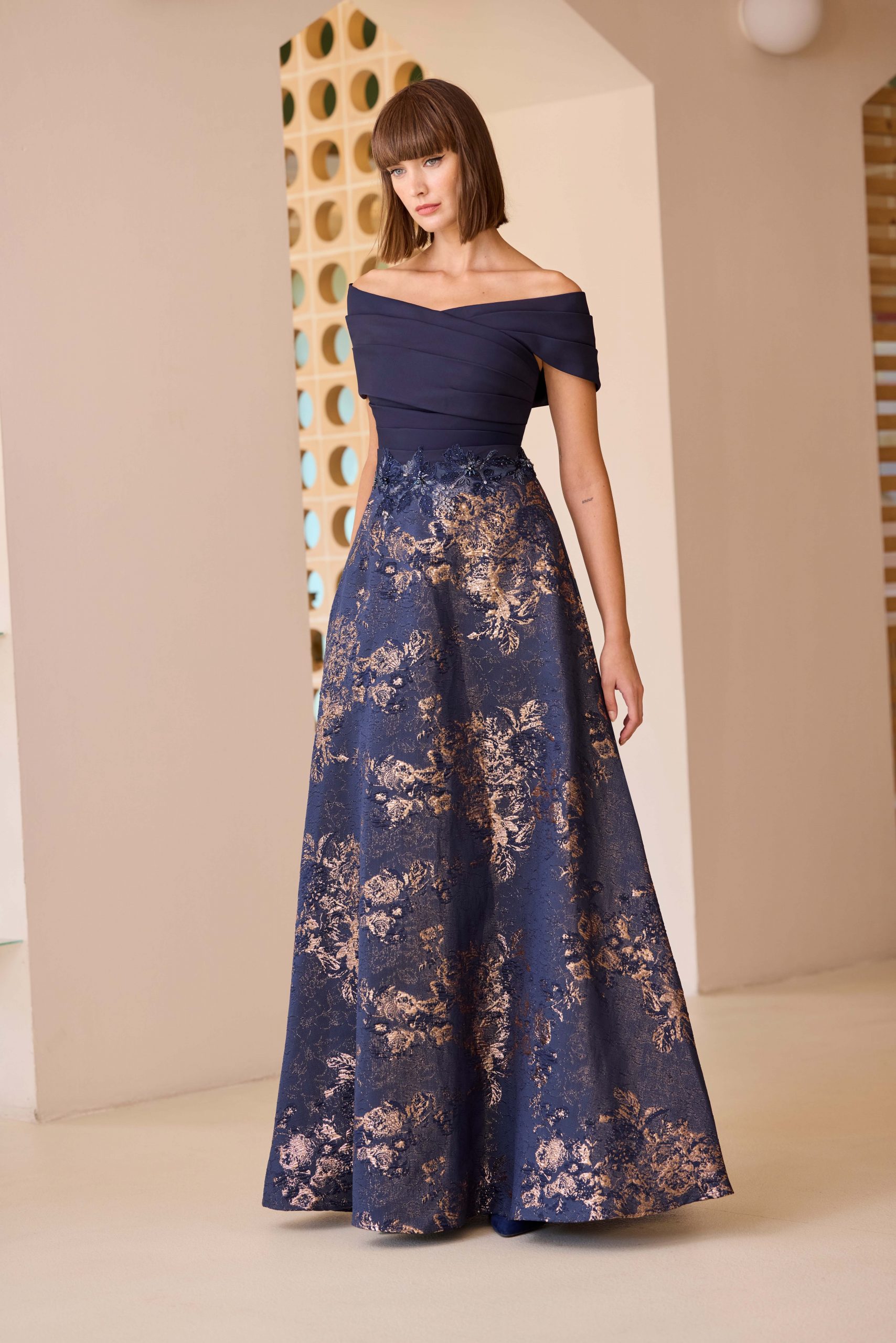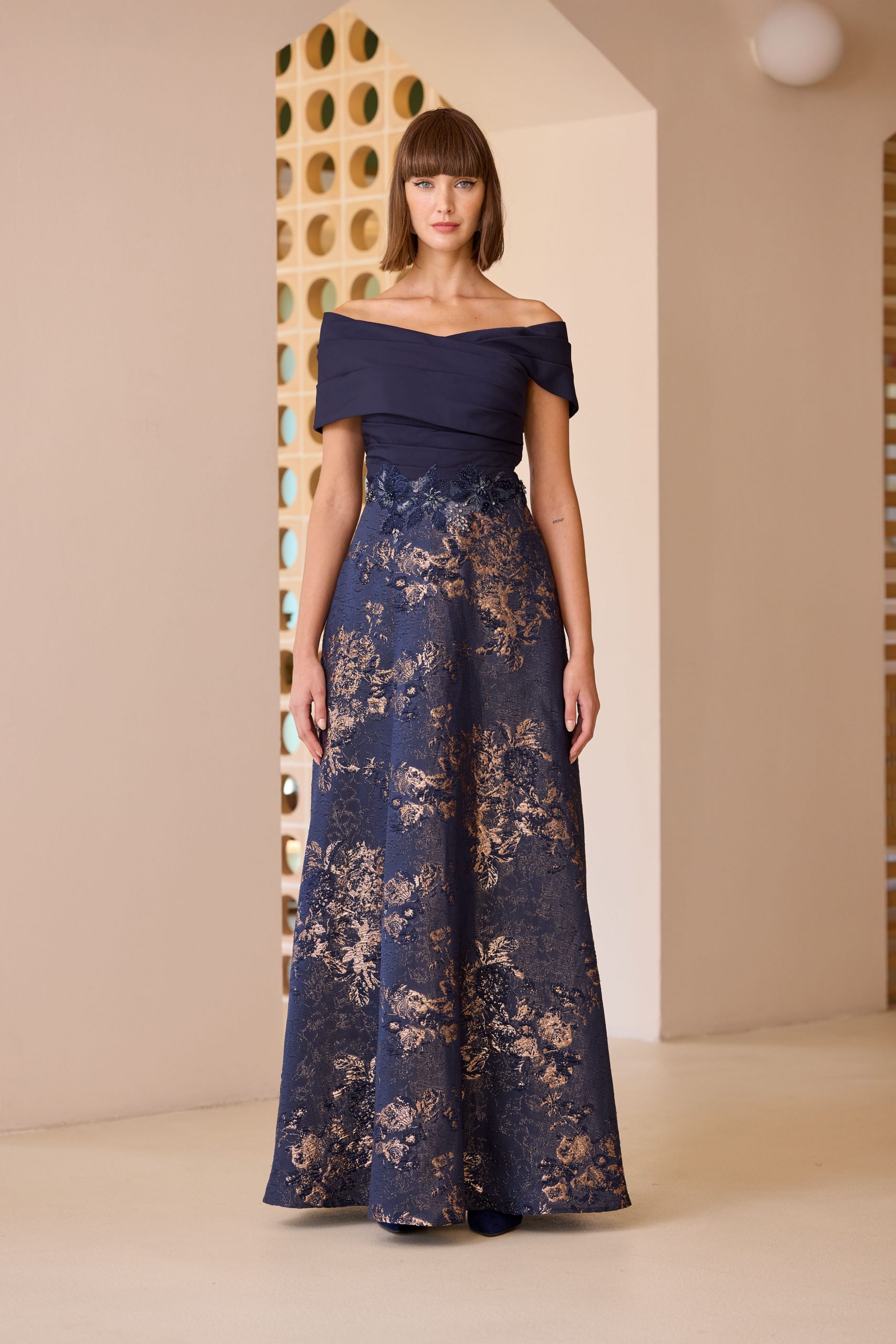Vestido largo cuerpo liso con brocado con dorado.