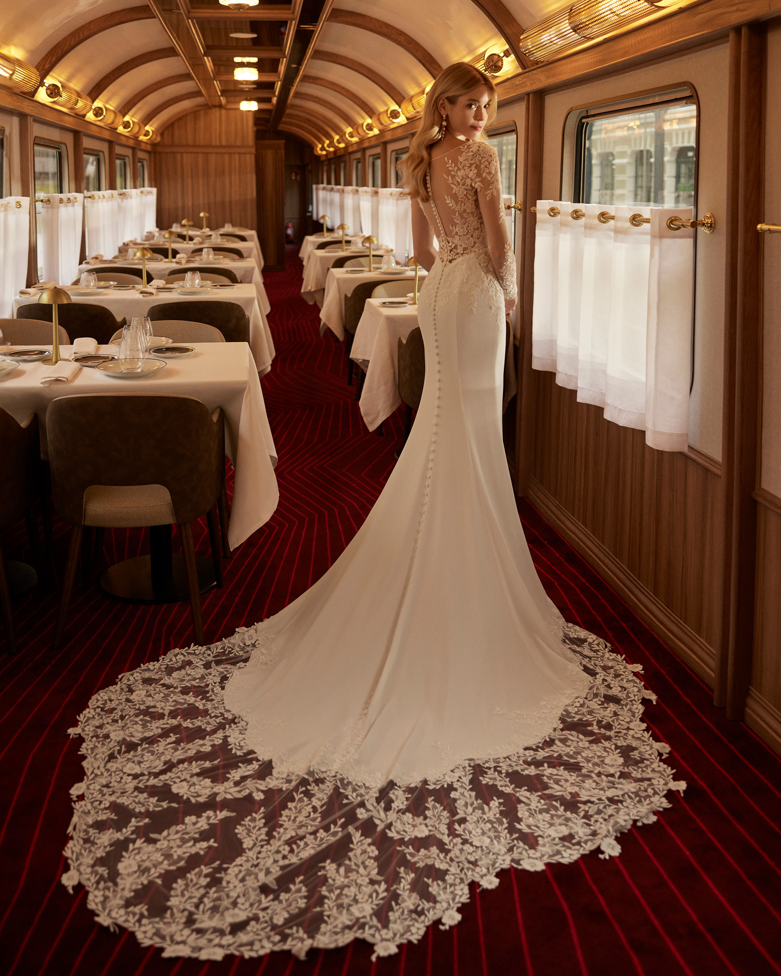 Vestido de novia largo, de corte sirena y estilo moderno, confeccionado en crepé con detalles en encaje y pedrería. Se completa con un escote en V, una espalda abotonada y manga larga. Un exclusivo look Aire Barcelona.